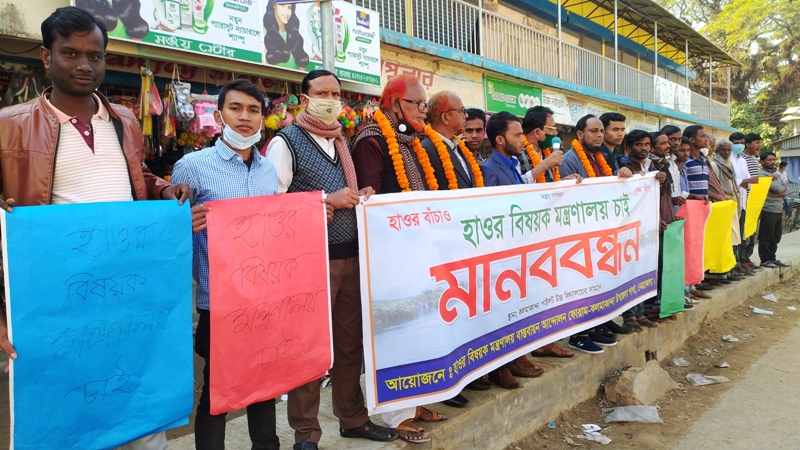 হাওর বিষয়ক মন্ত্রণালয়ের দাবিতে মানববন্ধন করেছে নেত্রকোনার কলমাকান্দা উপজেলায় হাওর বিষয়ক মন্ত্রণালয় বাস্তবায়ন আন্দোলন ফোরাম।