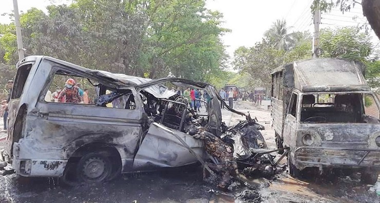 রাজশাহী মহানগর পুলিশের মুখপাত্র গোলাম রুহুল কুদ্দুস বলেন, মাইক্রোবাসে ১৭ জন যাত্রী ছিলেন। তারা সবাই মারা গেছেন। তিনি বলেন, দুর্ঘটনার খবর শুনে দ্রুত ঘটনাস্থলে যাই। পরে ফায়ার সার্ভিসের কর্মীরাও দুর্ঘটনাকবলিত এলাকায় গিয়ে আগুন নিয়ন্ত্রণে আনলেও ততক্ষণে মাইক্রোবাসে থাকা ১১ যাত্রীর সবাই পুড়ে মারা যায়। পরে গুরুতর আহত অবস্থায় ৮ জনকে উদ্ধার করে রাজশাহী মেডিকেল কলেজ হাসপাতালে ভর্তি করা হয়। সেখানে যাওয়ার পর আরো ৬ যাত্রী মারা যায়। স্থানীয় সিটিটিভি ফুটেজ দেখা যায়, ঘটনার সময় একটি বাঁশভর্তি ব্যাটারিচালিত ভ্যান গাড়ি ও এক কিশোর সাইকেল চালিয়ে শহরের অভিমুখে আসছিল। একই অভিমুখে দ্রুতগতিতে মাইক্রোবাসটিও আসছিল। বিপরীত দিক থেকে হানিফ পরিবহনের একটি বাস আসছিল।