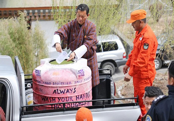মাত্র কয়েক ঘণ্টার মধ্যেই অনেক ফার্মেসি বা দোকানের মাস্ক ও জীবাণুনাশক ফুরিয়ে যায়। এ কারণে শনিবার শহরটিতে বিনামূল্যে জীবাণানাশক বিতরণ করা হয়। আর এ কাজে যোগ দেন ভুটানের প্রধানমন্ত্রী লোটে শেরিং নিজেই।