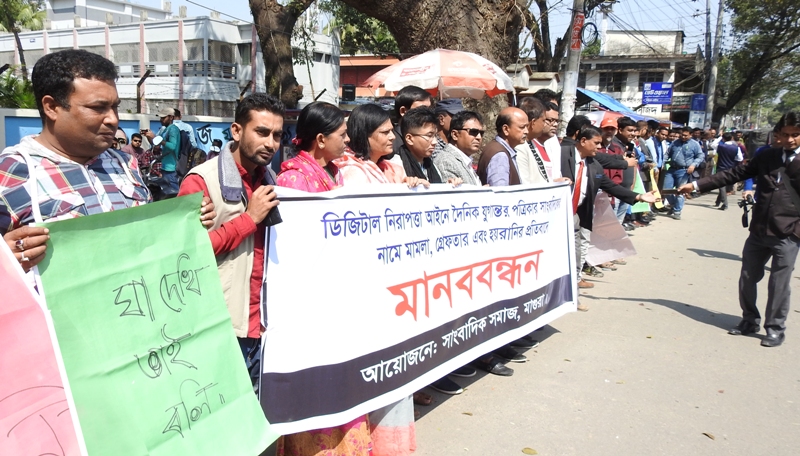 মাগুরায় আজ রবিবার সকালে যুগান্তরের চট্টগ্রামের লোহাগাড়া প্রতিনিধি মোহাম্মদ সেলিম উদ্দিনসহ দেশের বিভিন্ন জেলায় সাংবাদিকদের নামে ডিজিটাল নিরাপত্তা আইনে মামলা, গ্রেফতার এবং হয়রানির প্রতিবাদে মানববন্ধন সমাবেশ অনুষ্ঠিত হয়েছে।