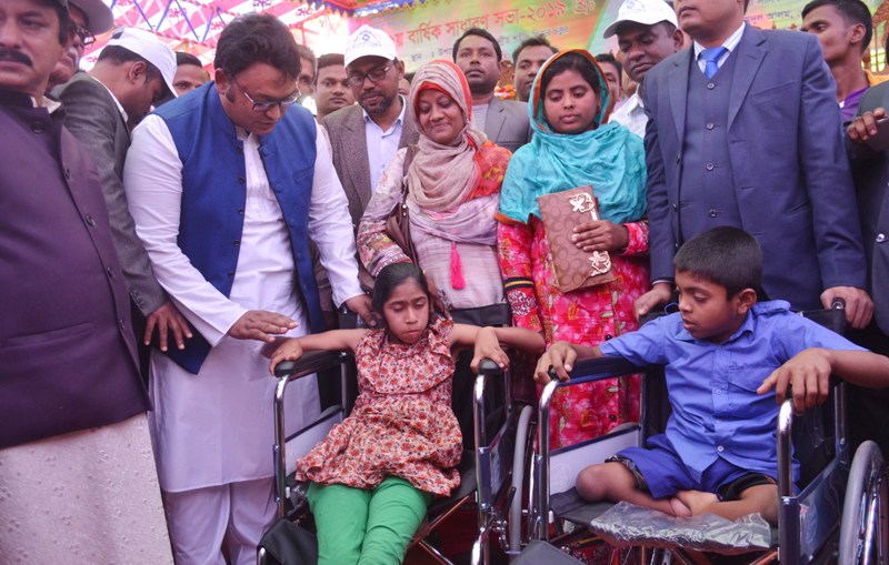 আলোচনা সভা শেষে প্রধান অতিথি প্রতিবন্ধী শিক্ষার্থীদের মাঝে হুইল চেয়ার বিতরন করেন।