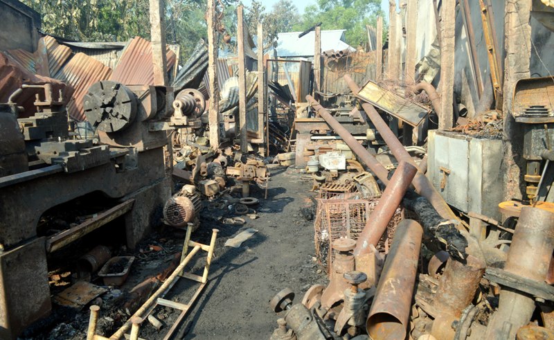 স্থানীয় সূত্রে জানাগেছে, শনিবার দিবাগত রাত আনুমানিক তিনটার দিকে কামারপট্টি মোড় এলাকায় ভাই ভাই ওয়ার্কসপে আগুন লাগে। মুহুর্তেই আগুনের লেলিহান শিখা চারিদিকে ছড়িয়ে পড়ে। পাশেই রমজান মেশিনারীজ ও সিফা মেশিনারীজ এন্ড ময়দার মিলে আগুন লেগে যায়। এ সময় রমজান মেশিনারীজের ভিতরে থাকা নতুন শ্যালো মেশিন, অটো ইজিবাইক, টায়ার, মবিল, পাম্প, ব্যাটারি, মোটর সাইকেল, ভূট্টা মাড়াই মেশিন, পাওয়ার টিলার মেশিন, পাওয়ার টিলারের বডিসহ প্রায় ৮০ লাখ টাকার মালামাল পুড়ে ভস্মিভূত হয়ে যায়। একই সময় ভাই ভাই ওয়ার্কসপের ২টি লেদ মেশিন, জেনারেটর, মোটর, ওয়েল্ডিং মেশিন, ডিল মেশিন, সেফার মেশিনসহ প্রায় ২০ লাখ টাকার মালামাল পুড়ে যায় এবং সিফা মেশিনারীজ এন্ড ময়দার মিলের মেশিন, মালামাল ও বিভিন্ন যন্ত্রাংশসহ প্রায় ৫০ লাখ টাকার ক্ষতি হয়। ক্ষতিগ্রস্থ ব্যবসায়ীদের দাবি এতে করে আগুনে পুড়ে প্রায় দেড় কোটি টাকার ক্ষতি হয়েছে। ধারনা করা হচ্ছে বৈদ্যুতিক শর্ট সার্কিটের মাধ্যমে আগুনের সূত্রপাত হয়েছে। সর্বস্ব হারিয়ে দিশেহারা হয়ে পড়েছেন ক্ষতিগ্রস্থ ব্যবসায়ীরা।