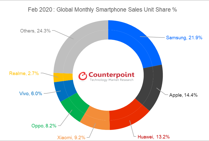 জনপ্রিয় গবেষণা সংস্থা কাউন্টার পার্টের মাসিক মার্কেট পালস ফেব্রুয়ারি ২০২০ রিপোর্ট অনুযায়ী বৈশ্বিক স্মার্টফোন মার্কেটে ২ দশমিক ৭ শতাংশ মার্কেট শেয়ার নিয়ে বৈশ্বিক র্যাঙ্কিং এ আগের মতোই ৭ নাম্বারে অবস্থান করছে রিয়েলমি।