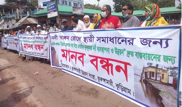 কুড়িগ্রামের ভূরুঙ্গামারীতে নদীভাঙন রোধে দ্রুত কার্যকর স্থায়ী পদক্ষেপ গ্রহণ দাবিতে মানববন্ধন কর্মসূচি পালিত হয়েছে।