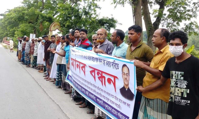 গোপালগঞ্জের মুকসুদপুর বাওড়ে নিজস্ব মালিকানাধীন জমিতে অবৈধভাবে খাল খনন বন্ধ করার দাবিতে মানব বন্ধন করেছে এলাকাবাসী।