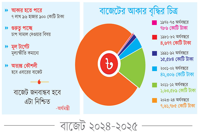 জানা গেছে, নতুন অর্থবছরের বাজেটের আকার হতে পারে ৭ লাখ ৯৬ হাজার ৯০০ কোটি টাকার কমবেশি। এটি বর্তমান ২০২৩-২৪ অর্থবছরের চলমান বাজেটের তুলনায় ৪ দশমিক ৬০ শতাংশ বেশি। টাকার অঙ্কে নতুন অর্থবছরের বাজেট বাড়ছে ৩৫ হাজার ১১৫ কেটি টাকা।