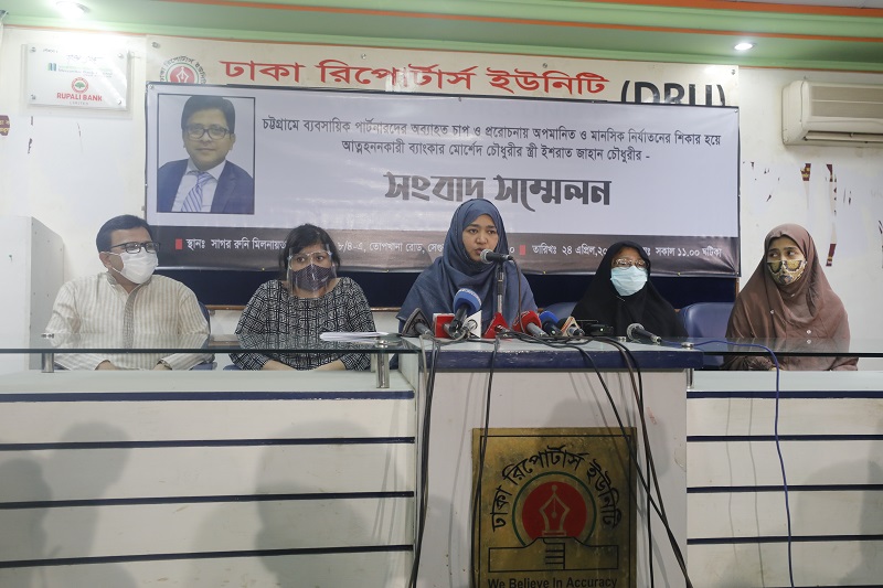 চট্টগ্রামের ব্যাংকার মোর্শেদ চৌধুরীকে হুমকি ও মানসিক চাপ প্রয়োগে আত্মহত্যায় বাধ্য করায় শারুন চৌধুরীসহ সব অভিযুক্তকে বিচারের আওতায় আনার দাবি জানিয়েছেন মোর্শেদ চৌধুরীর স্ত্রী ও স্বজনরা। গতকাল শনিবার সকালে ঢাকা রিপোর্টার্স ইউনিটির সাগর-রুনি মিলনায়তনে এক সংবাদ সম্মেলনে তারা এ দাবি জানান। সংবাদ সম্মেলনে ব্যাংকার মোর্শেদ চৌধুরীর স্ত্রী ছাড়াও মোর্শেদ চৌধুরীর মা নুর নাহার এবং কন্যা মোবাশ্বিরা জাহান চৌধুরী জুম উপস্থিত ছিলেন। মোর্শেদ চৌধুরীর স্ত্রী ইশরাত জাহান চৌধুরী বলেন, আমার স্বামীর আত্মহত্যার প্রায় আড়াই সপ্তাহ পার হয়ে গেলেও কোনো এক অদৃশ্য কারণে সম্পূর্ণ তথ্য প্রমাণ থাকা সত্ত্বেও অপরাধী ও অভিযুক্তরা এখনো ধরাছোঁয়ার বাইরে রয়েছে। এর পাশাপাশি তারা বিভিন্নভাবে আমাকে ও আমার পরিবারকে চাপের মুখে রেখেছে।