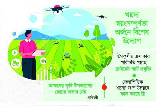ক্রমবর্ধমান জনসংখ্যার খাদ্যের চাহিদা পূরণের স্মার্ট প্রযুক্তির প্রসার ঘটছে কৃষিতে। মাটির স্বাস্থ্য পরীক্ষা, রোগবালাই চিহ্নিতকরণ, জমি তৈরি, বীজ বপন, সার প্রয়োগ, কীটনাশক স্প্রে, পোকামাকড় দমন, তাপমাত্রা নিয়ন্ত্রণ, সেচ, আগাছা দমন, ফসল কাটা, মাড়াই, ঝাড়াইসহ প্রায় সব ক্ষেত্রেই আধুনিক প্রযুক্তির ব্যবহার বাড়ছে। ফসলের জমিতে বিভিন্ন ধরনের ডিজিটাল কীট ব্যবহারে প্রতি মুহূর্তেই কৃষকের কাছে পৌঁছে যাচ্ছে ফসলের আপডেট। এক্ষেত্রে সরকারিভাবেও চালু হয়েছে নানান প্রযুক্তি, দেওয়া হচ্ছে এসএমএস, জানানো হচ্ছে আবহাওয়া বার্তা। কোনো কোনো সংস্থা আবার কৃষিকাজে কৃত্রিম বুদ্ধিমত্তাসমৃদ্ধ অ্যাপ এবং ড্রোন ব্যবহার করছে বলে জানিয়েছেন কৃষি বিশেষজ্ঞরা। গুরুত্ব দেওয়া হচ্ছে জলবায়ু পরিবর্তনের সঙ্গে সামঞ্জস্য রেখে কৃষিপণ্যের জাত উন্নয়নের পাশাপাশি সময় ও শ্রম কমাতে স্মার্ট প্রযুক্তির ব্যবহার। ফলে বিগত বছরগুলোতে ধান থেকে শুরু করে মানুষের নিত্যপ্রয়োজনীয় সব দানাদার পণ্যেরই উৎপাদনই প্রায় দ্বিগুণ হয়েছে।