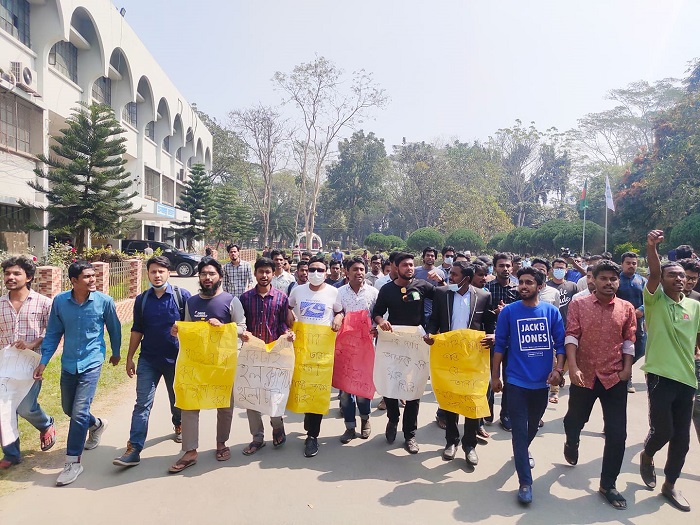 এসময় ‘লাথি মার ভাঙরে তালা, খুলে ফেল হলের তালা’, ‘একদফা একদাবি, হল কবে খুলে দিবি’, ‘শিক্ষক-কর্মকর্তা ভেতরে, আমরা কেন বাহিরে’, ‘প্রশাসনের প্রহসন, মানি না মানবো না’, ‘আমার হল বন্ধ কেন, প্রশাসন জবাব চাই’ প্রভৃতি স্লোগান দিতে দেখা যায় আন্দোলনকারী শিক্ষার্থীদের।