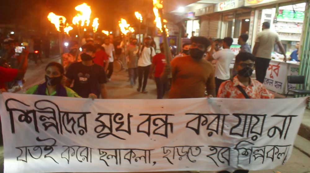 হাতে মশাল, মুখে বাধা কালো কাপড়। তার উপর ক্রস চিহ্ন কারোর মুখে কোন কথা নেই, নেই কোন স্লোগান। সামনে একজন ড্রাম বাজিয়ে এগিয়ে যাচ্ছে। সাদা একটি কাপড়ে মোটা দাগে লেখা “শিল্পীদের মুখ বন্ধ করা যায় না” ”যতই করো ছলাকলা, ছাড়তে হবে শিল্পকলা” তারপর সেই মশাল মিছিলটির শহর প্রদক্ষিণ।