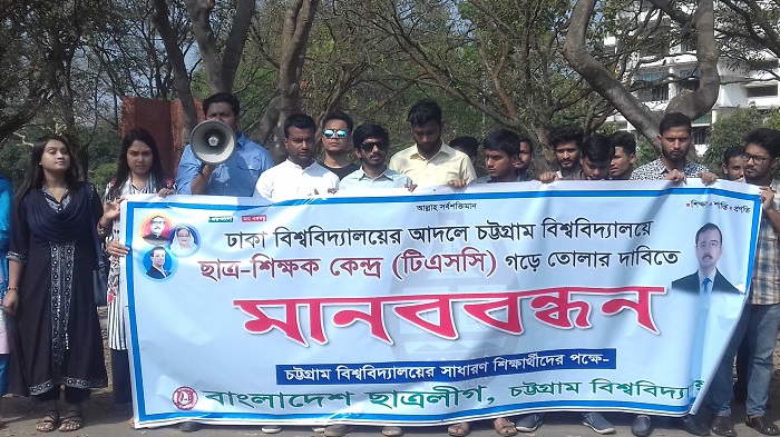 ঢাকা বিশ্ববিদ্যালয়ের আদলে চট্টগ্রাম বিশ্ববিদ্যালয়ে (চবি) ছাত্র শিক্ষক কেন্দ্র (টিএসসি) গড়ে তোলার দাবিতে মানববন্ধন করেছে ছাত্রলীগের একাংশের নেতাকর্মীরা। আজ সোমবার দুপুরে চবির শহীদ মিনার চত্বরে এ মানববন্ধন হয়।
