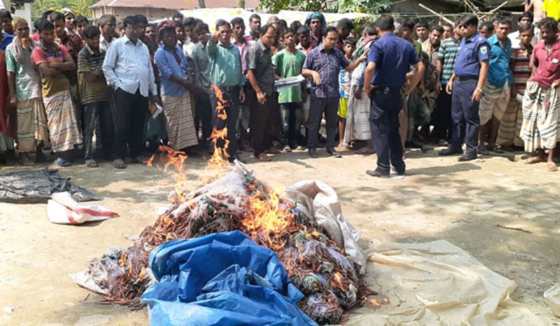 পাবনার চাটমোহর উপজেলার অমৃতকুন্ডা (রেলবাজার) হাটে নিষিদ্ধ কারেন্ট জাল পোড়ানো হয়।