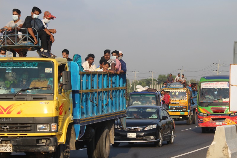 শুক্রবার সরেজমিন পরিদর্শন করে দেখা গেছে, শিশু থেকে শুরু করে বৃদ্ধ পর্যন্ত নাড়ির টানে বাড়ি ফেরার নেশায় পিকআপ, ট্রাক, বাসের ছাদে উঠে জীবনের ঝুকি নিয়ে রওনা হয়েছেন। অনেকেই আবার ব্যক্তিগত প্রাইভেটকার, মাইক্রোবাস ও মোটরসাইকেলও ব্যবহার করছেন। অতিরিক্ত যানবাহন চলাচলের কারণে মহাসড়কে মাঝে মাঝে যানজট ও থেমে থেমে যানবাহন চলাচল করতে দেখা গেছে।