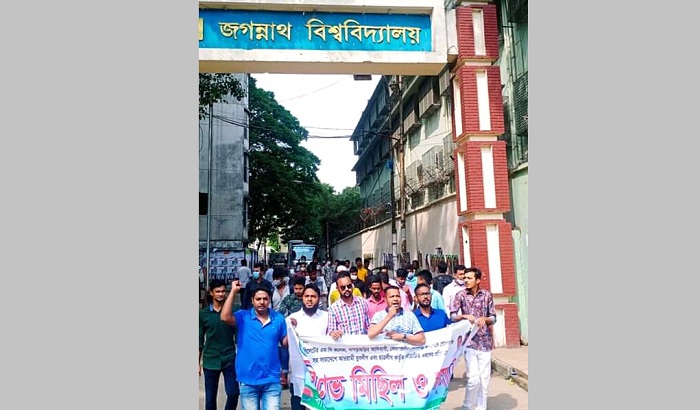 জগন্নাথ বিশ্ববিদ্যালয় ছাত্রদলের যুগ্ম সাধারণ সম্পাদক আসাদুজ্জামান আসলাম এর নেতৃত্বে বুধবার সকাল সাড়ে ১০ টায় এ বিক্ষোভ মিছিল করা হয়।