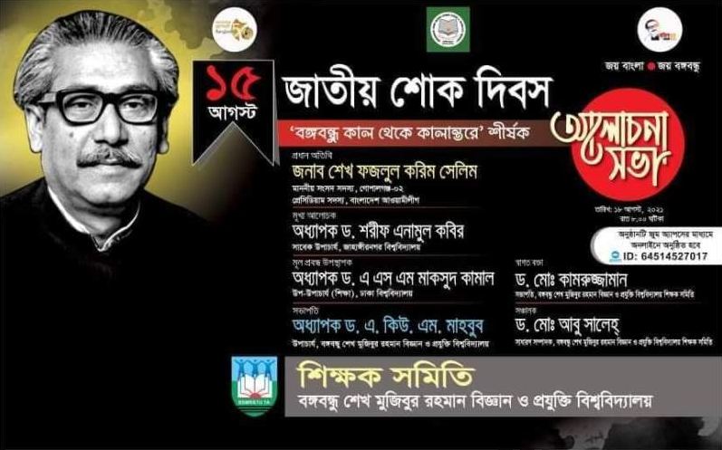জাতির পিতা বঙ্গবন্ধু শেখ মুজিবুর রহমান স্মরণে শোক দিবস উপলক্ষে গোপালগঞ্জের বঙ্গবন্ধু শেখ মুজিবুর রহমান বিজ্ঞান ও প্রযুক্তি বিশ্ববিদ্যালয় (বশেমুরবিপ্রবি) শিক্ষক সমিতির উদ্যোগে "বঙ্গবন্ধু কাল থেকে কালান্তর" শীর্ষক আলোচনা সভার আয়োজন করা হয়েছে।