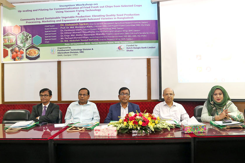বাংলাদেশ কৃষি গবেষণা ইনস্টিটিউট (বারি) এর পাস্টহারভেস্ট টেকনোলজি বিভাগ ও সবজি বিভাগ, উদ্যানতত্ত্ব গবেষণা কেন্দ্র এর উদ্যাগে “আপ-স্লিং এন্ড পাইলেটিং ফোর কমার্শিয়ালাইজেশন অফ ফ্রাইড ফ্রেশ-কাট চিপসের ফরম সিলেক্টেড ক্রোপস ইউজিং ভ্যাকুয়াম ফ্রাইং টেকনোলজি” এবং ”কমিউনিটি বেসড সাসটেইনবল ভেজিটবলস প্রাডাকশন: এলিভটিং কায়োলিটি সিড প্রোডাকশন, প্রসেসিং, মার্কেটিং এন্ড এক্সপ্যানশন অফ বিএআরআই রিলিজড ভ্যারাইটিজ ইন বাংলাদেশ” শীর্ষক কর্মশালা ২০ সেপ্টম্বর ২০২৩ বুধবার বারি’র সেমিনার রুমে অনুষ্ঠিত হয়েছে। ডাচ বাংলা ব্যাংক লিমিটেড (ডিবিবিএল), ঢাকা এর অথার্য়নে আয়োজিত এ কর্মশালায় বারি’র বিভিন্ন বিভাগ ও কেন্দ্রের বিজ্ঞানী ও কর্মকর্তাবৃন্দ অংশগ্রহণ করেন।
