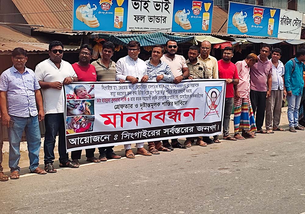 মানিকগঞ্জের সিংগাইরের জয়মন্টপ ইউনিয়নের নাজিরপুর ঢোলখালপাড় গ্রামের রাজ মিস্ত্রি শুক্রর আলীর নবজাতক কে ঔই হাসপাতালে ভুল চিকিৎসায় দুটি পায়ের আঙ্গুল দগ্ধ হওয়ায় মামলার মুল আসামি চিকিৎসক মাহমুদা সুলতানা সাকি কে গ্রেপ্তার করে দৃষ্টান্ত মূলক শাস্তির দাবিতে মানববন্ধন করেছে স্থানীয়রা। বুধবার সকাল১১ টার দিকে উপজেলা পুরাতন বাসস্ট্যান্ডে শিশুর স্বজন ও এলাকাবাসীর উদ্যোগে এ মানববন্ধন কর্মসূচী অনুষ্ঠিত হয়।