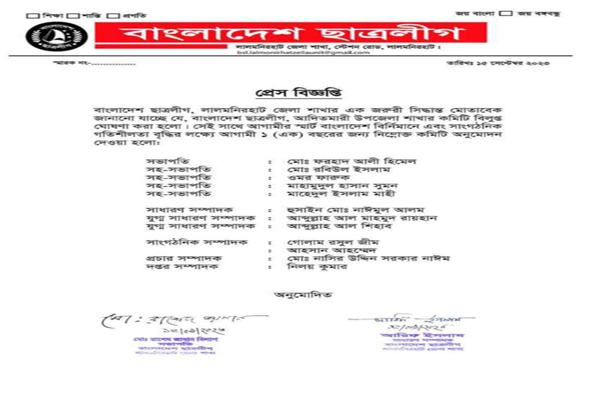 শুক্রবার (১৫ সেপ্টেম্বর) রাতে লালমনিরহাট জেলা ছাত্রলীগের সভাপতি রাশেদ জামান বিলাশ ও সাধারণ সম্পাদক আরিফ ইসলাম সাক্ষরিত এক প্রেস বিজ্ঞপ্তি জেলা ছাত্রলীগের ফেসবুক পেজ'এ প্রকাশের মাধ্যমে এ তথ্য জানানো হয়।