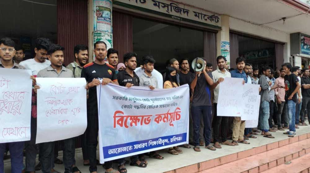 সজীব মিয়ার সভাপতিত্বে ও হবিগঞ্জ জেলা ছাত্র ইউনিয়নের সাধারণ সম্পাদক ইমদাদ মোহাম্মদ এর পরিচালনায় অনুিিষ্ঠত মানববন্ধনে বক্তব্য রাখেন- হবিগঞ্জ জেলা ছাত্র ইউনিয়নের সাংগঠনিক সম্পাদক আনাছ মো৯হাম্মদ, সুশান্ত দাস গুপ্ত,ধীরেন্দ্র মল্লিক, নাঈম আহমেদ ও ফয়সল মিয়া প্রমুখ। মানববন্ধনে শিক্ষার্থীরা অবিলম্বে কোটা বাতিলের দাবি জানান অন্যথায় সারা দেশে বৃহত্তর আন্দোলনের হুঁশিয়ারি করে দেন। পরে এক বিক্ষোভ মিছিল অনুষ্ঠিত হয়। এ সময় শিক্ষার্থীরা - ‘মেধা না কোটা?, মেধা মেধা’, ‘এই বাংলায় হবে না, বৈষম্যের ঠিকানা’, ‘সংবিধানের মূল কথা, সুযোগের সমতা, ‘৭১ এর বাংলায়, বৈষম্যের ঠাঁই নাই’, ‘সারা বাংলায় খবর দে, কোটা প্রথার কবর দে’, ‘জেগেছে রে জেগেছে, ছাত্র সমাজ জেগেছে’, ‘সংগ্রাম না রাজপথ, রাজপথ রাজপথ’, ‘আমার সোনার বাংলায়, বৈষম্যের ঠাঁই নাই’, ‘এসো ভাই এসো বোন, গড়ে তুলি আন্দোলন’, ‘আঠারোর হাতিয়ার, গর্জে ওঠো আরেকবার’, ‘মুক্তিযুদ্ধের হাতিয়ার, গর্জে ওঠো আরেকবার’সহ বিভিন্ন স্লোগান দেন।