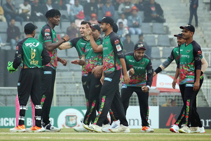 গুলবাদিন নাইব ১৮ বলে ১২ রান করে আউট হলে ম্যাচ থেকে ছিটকে রাজধানীর দলটি। এরপর আরাফাত সানি (২) ও শরিফুল ইসলাম (৫) আউট হলেও ব্যাট চালাতে থাকেন তাসকিন আহমেদ। শেষ ওভারের চার বলে তাসকিন ১৫ রান তুললেও হার এড়াতে পারে ঢাকা।