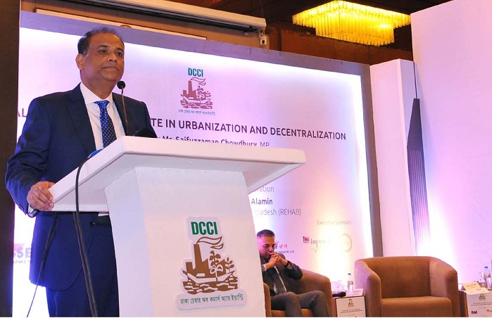 আজ রোববার রাজধানীর সোনারগাঁও হোটেলে ‘নগরায়ন ও বিকেন্দ্রীকরণে আবাসন খাতের চ্যালেঞ্জ’ শীর্ষক সেমিনারে প্রধান অতিথির বক্তব্যে একথা বলেন। সেমিনারের আয়োজন করে ঢাকা চেম্বার অব কমার্স অ্যান্ড ইন্ডাস্ট্রি (ডিসিসিআই)।
