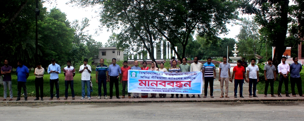 বিশ্ববিদ্যালয় মঞ্জুরী কমিশন (ইউজিসি) কর্তৃক প্রস্তাবিত পাবলিক বিশ্ববিদ্যালয়সমুহে শিক্ষক নিয়োগ ও পদোন্নতির ক্ষেত্রে অভিন্ন নীতিমালা বাতিলের দাবিতে মানববন্ধন করেছে ইসলামী বিশ্ববিদ্যালয়ের (ইবি) শিক্ষকরা।