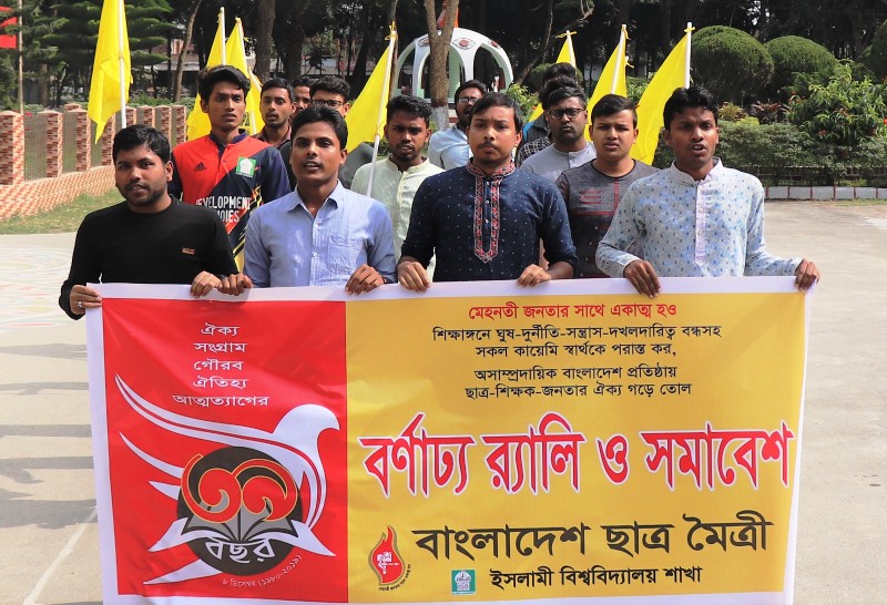 ‘মেহনতী জনতার সাথে একাত্ম হও, শিক্ষাঙ্গনে ঘুষ-দুর্নীতি-সন্ত্রাস-দখলদারিত্ব বন্ধসহ সকল কায়েমী স্বার্থকে পরাস্ত কর’ স্লোগানে ইসলামী বিশ্ববদ্যিালয়ে (ইবি) ছাত্রমৈত্রীর ৩৯তম প্রতিষ্ঠাবার্ষিকী উদযাপিত হয়েছে। দিবসটি উপলক্ষ্যে দুই দিনব্যাপী কর্মসূচী পালন করেছে ইবি শাখা ছাত্রমৈত্রী।