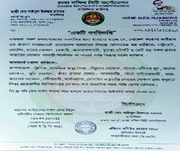 তবে খোলা থাকবে মুদি দোকান, হাসপাতাল, ব্যাংক-এটিএমবুথ, ফার্মেসি। আজ রোববার সকালে, ঢাকা দক্ষিণ সিটি করপোরেশন এক বিজ্ঞপ্তির মাধ্যমে এ নির্দেশনা দেয়।