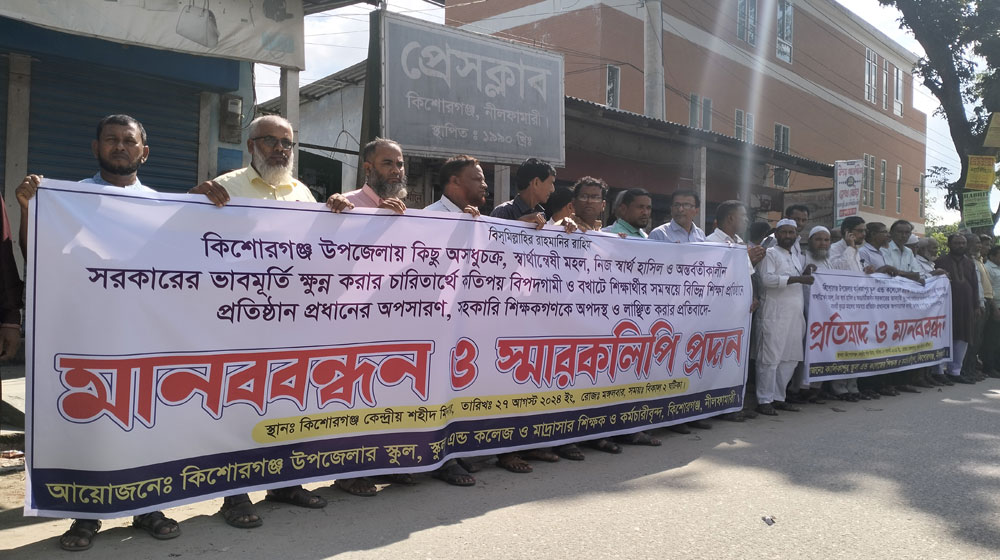 সম্প্রতি কিশোরগঞ্জ উপজেলার কয়েকটি শিক্ষা প্রতিষ্ঠানে বৈষম্যবিরোধী ছাত্র আন্দোলনের ব্যানারে বিভিন্ন প্রতিষ্ঠান প্রধানদের অপসারণের দাবিতে মানববন্ধন, বিক্ষোভ, শিক্ষকদের অবরুদ্ধ ও অফিস কক্ষে তালা ঝুলে দেয়ার ঘটনা ঘটেছে। এছাড়া শিক্ষকদের আটকে রাখার মত ঘটনাও করেছে বলে শিক্ষকরা জানান। শিক্ষকদের অপদস্ত ও জোর করে পদত্যাগপত্রে স্বাক্ষর নেয় ছাত্রদের ব্যানারে কিছু অসাধুচক্র। এসব ঘটনার প্রতিবাদে স্কুল, কলেজ ও মাদ্রাসার শিক্ষকবৃন্দরা মঙ্গলবার দুপুরে কিশোরগঞ্জ প্রেস ক্লাবের সামনে প্রায় ১ হাজার শিক্ষক-কর্মচারী মানববন্ধন করে। এ সময় উপজেলার মাধ্যমিক শিক্ষক সমিতির সভাপতি ও কিশোরগঞ্জ বহুমূখি মডেল উচ্চ বিদ্যালয়ের প্রধান শিক্ষক মোঃ গোলাম আজম বলেন- গত কয়েকদিন ধরে কিশোরগঞ্জ বৈষম্যবিরোধী ছাত্র আন্দোলনের ব্যানারে কুচক্রি মহল বিভিন্ন শিক্ষা প্রতিষ্ঠান প্রধানদের বিরুদ্ধে নানা অভিযোগ তুলে জোড়র্পূবক পদত্যাগের চেষ্ঠা করে।