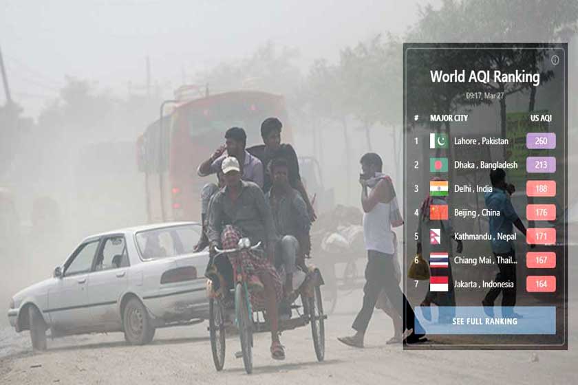 এ ছাড়া স্কোর ২৬০ নিয়ে প্রথম স্থানে রয়েছে পাকিস্তানের লাহোর। ১৮৮ স্কোর নিয়ে তৃতীয় স্থানে রয়েছে ভারতের দিল্লি, ১৭৬ স্কোর নিয়ে চতুর্থ স্থানে চীনের বেইজিং এবং ১৭১ স্কোর নিয়ে পঞ্চম স্থানে রয়েছে নেপালের কাঠমান্ডু।