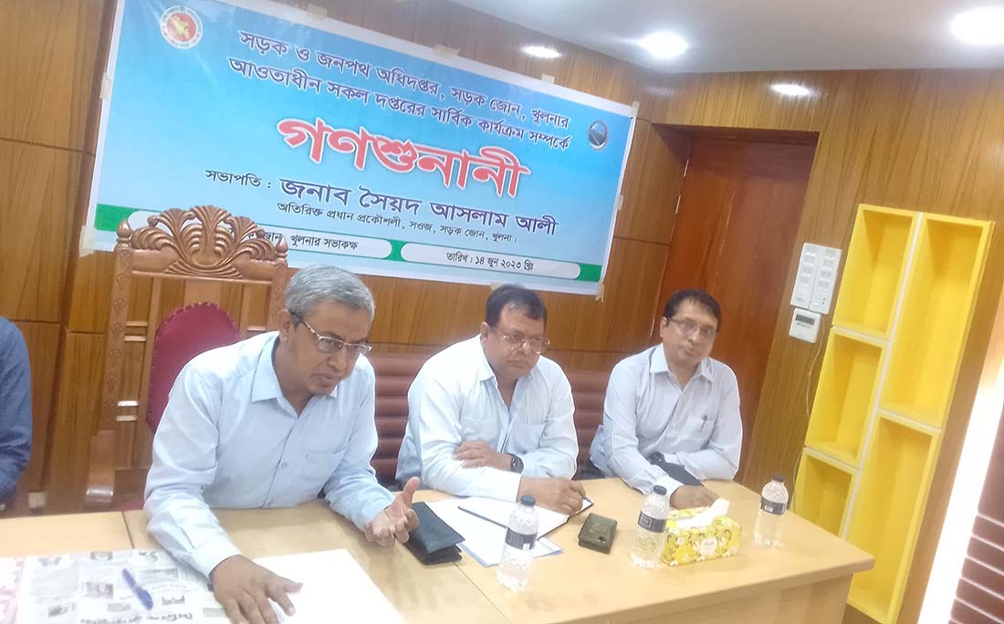 বুধবার সড়ক ও জনপথ অধিদপ্তর খুলনা জোনের আওতায়ধীন সকল দপ্তরের কার্যক্রম সম্পর্কে গণশুনানী অনুষ্ঠিত হয়েছে। খুলনা জোনের অতিরিক্ত প্রধান প্রকৌশলী সৈয়দ আসরাফ আলীর সভাপতিত্বে মুক্ত আলোচনায় অংশ নেন ঠিকাদারবৃন্দ, বিশিষ্ট নাগরিক ও সাংবাদিকবৃন্দ।