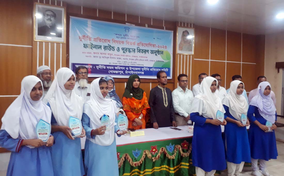 গোমস্তাপুরে দুইদিন ব্যাপি দুর্নীতি প্রতিরোধ বিষয়ক বিতর্ক প্রতিযোগিতার সমাপনী অনুষ্ঠানের আয়োজন করা হয়েছে। প্রতিযোগিতায় চ্যাম্পিয়ন হয়েছেন আলিনগর বালিকা উচ্চ বিদ্যালয় ও রানারআপ আলিনগর স্কুল ও কলেজ। বিতর্ক প্রতিযোগিতায় শেষ্ঠ বক্তা নির্বাচিত হয়েছেন আলিনগর বালিকা উচ্চ বিদ্যালয়ের দলনেতা জয়নব খানম। দুর্নীতি দমন কমিশন ও উপজেলা দুর্নীতি প্রতিরোধ কমিটির আয়োজনে এই বিতর্ক প্রতিযোগিতার আয়োজন করা হয়। বুধবার সকাল উপজেলা পরিষদ সভাকক্ষে বিতর্ক প্রতিযোগিতা শেষে বিজয়ীদের মধ্যে পুরস্কার তুলে দেওয়ার হয়েছে। পুরস্কার তুলে দেন উপজেলা নির্বাহী কর্মকর্তা (ইউএনও) আসমা খাতুন। পরে অনুষ্ঠিত আলোচনা সভায় সভাপতিত্ব করেন উপজেলা দুর্নীতি প্রতিরোধ কমিটির সভাপতি আতিকুল ইসলাম আজম। অন্যদের মধ্যে বক্তব্য দেন উপজেলা মাধ্যমিক শিক্ষা কর্মকর্তা ফেরদৌসী বেগম, আলিনগর স্কুল ও কলেজের অধ্যক্ষ রবিউল আওয়াল, সমাজ সেবক ও সংগঠক আফতাব উদ্দিন লালান, উপজেলা দুর্নীতি প্রতিরোধ কমিটির সাধারণ সম্পাদক সারওয়ার জাহান সুমনসহ অনেকে। অনুষ্ঠানে বক্তারা বলেন, দুর্নীতির বিরুদ্ধে আমরা সকলে মিলে সোচ্চার হতে হবে। সেইসঙ্গে সবাইকে এর বিরুদ্ধে সচেতন হওয়ার প্রয়োজন। তাঁরা আরও বলেন, দুর্নীতি প্রতিরোধ করতে না পারলেও দুর্নীতিবাজকে ঘৃণা করে এই দুর্নীতি রোধ করা সম্ভব। উল্লেখ্য গত দুইদিন ব্যাপি এই বিতর্ক প্রতিযোগিতায় উপজেলার ৮টি শিক্ষা প্রতিষ্ঠান অংশ নেয়।