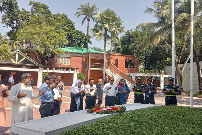 জাতির পিতার প্রতিকৃতিতে শ্রদ্ধা নিবেদনকালে তিনি বঙ্গবন্ধুসহ তাঁর পরিবারের যে সদস্যবৃন্দ শহীদ হন তাঁদের রুহের মাগফিরাত কামনা করেন এবং মাননীয় প্রধানমন্ত্রী শেখ হাসিনাসহ বঙ্গবন্ধুর পরিবারে যারা জীবিত আছেন তাঁদের জন্য দোয়া এবং দীর্ঘায়ু কামনা করেন। তিনি সমাধীস্থলে রক্ষিত পরিদর্শন বহিতে স্বাক্ষর করেন।