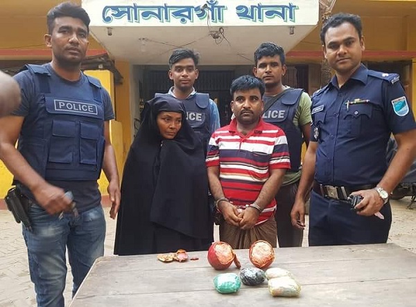 সোনারগাঁ থানার উপ-পরিদর্শক (এসআই) আবুল কালাম আজাদ জানান, মাদক বিরোধী অভিযান চালিয়ে গোপন সংবাদের ভিত্তিতে উপজেলার পিরোজপুর ইউনিয়নের মেঘনা নিউটাউন মার্কেটের পাশে আম পাতা রেস্তোরার সামনে থেকে কথিত মা খুশি আক্তার (৫৫) ও শাহ আলম নামের দুই মাদক ব্যবসায়ীকে আটক করা হয়েছে। এসময় তাদের কাছ থেকে দুইটি ডালিমের ভেতর থেকে ৮ হাজার পিস ইয়াবা উদ্ধার করা হয়। আটককৃত মাদক ব্যবসায়ীদের বিরুদ্ধে মাদক দ্রব্য নিয়ন্ত্রন আইনে মামলা দায়ের করে আদালতে পাঠানো হবে।
