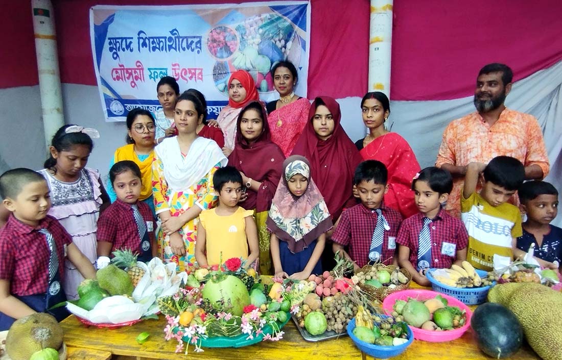 সরেজমিন দেখা গেছে, স্কুল প্রাঙ্গনে শিশু শিক্ষার্থীরা টেবিলের উপর আম,জাম, কাঠাল,কলা পেপে, আনারস, সফেদা, কামরাঙ্গা, আমলকি,আমড়া, করমোচা, নারকেল,লিচু,দেশী খেজুর,গাব,চালিতা,পেয়ারা,জামরুল,ডেওয়া, লটকন,কাগজি লেবু,বাতাবি লেবু, আশ ফল.তাল,বেলসহ প্রায় ৫০ প্রকার ফলের সমাহর ছিল।
