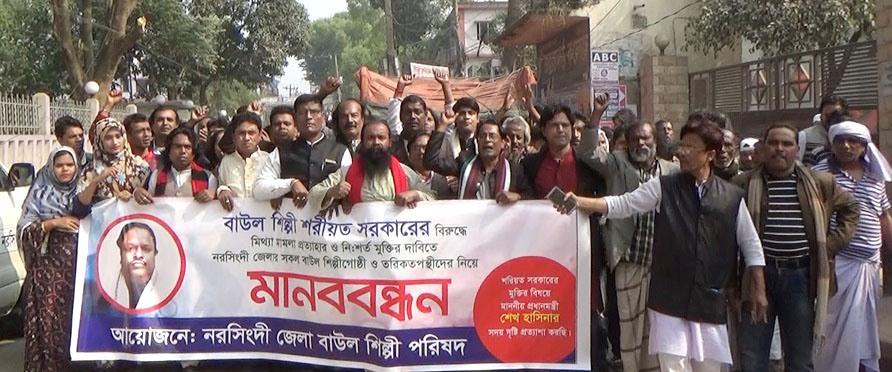 আজ রোববার বিকালে জেলা বাউল শিল্পী পরিষদের উদ্যোগে নরসিংদী প্রেসক্লাবের সামনে এ মানববন্ধন অনুষ্ঠিত হয়। এসময় শত শত বাউল শিল্পীরা র্যালিসহ মানববন্ধনে অংশগ্রহন করেন।