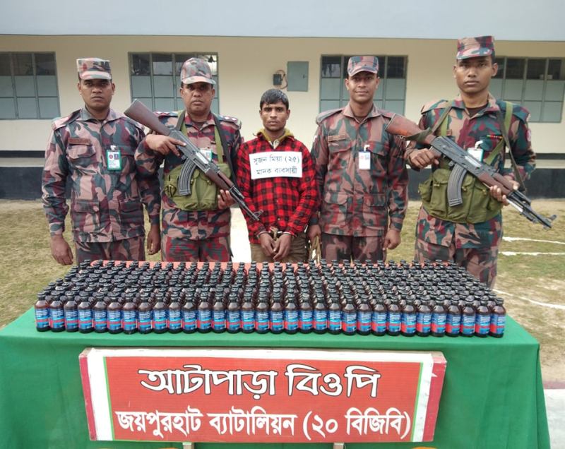 জয়পুরহাটের পাঁচবিবিতে ফেনসিডিলিসহ সুজন (২৫) নামের এক মাদক চোরাকারবারিকে আটক করছেন বিজিবির সদস্যরা। এ সময় তার কাছ থেকে ৩'শ ১ বোতল ফেনসিডিল উদ্ধার করে বিজিবির সদস্যরা।