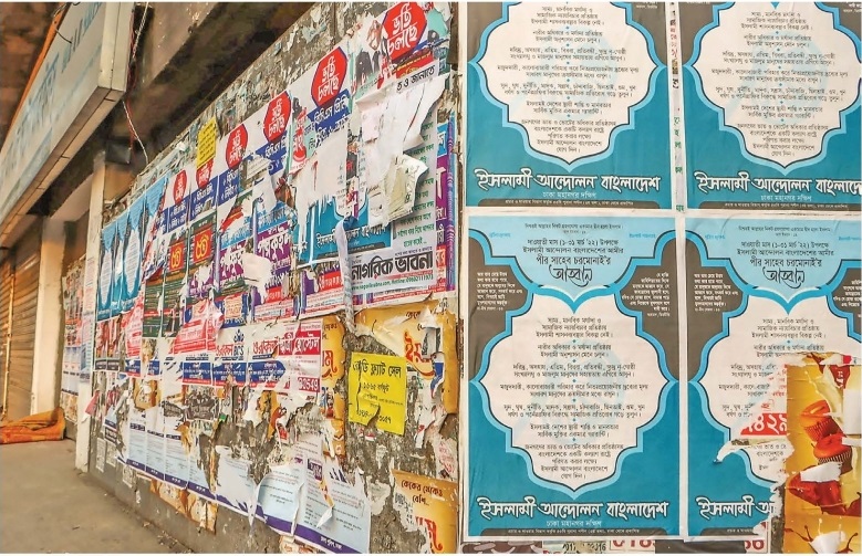 শুধু দেয়াল বা প্রাচীরই নয়, রাজধানীবাসীর স্বপ্নের মেট্রোরেলের পিলারও পোস্টারের কবল থেকে রক্ষা পায়নি। যে যেভাবে পেরেছেন নিজের প্রচারের স্বার্থে পোস্টার লাগিয়েছেন। রাজধানীর আজিমপুর মোড়ে দেখা যায়, ফুটপাতে বাঁশ পুতে লাগানো হয়েছে বিলবোর্ড। যার কারণে পথচারীদের পথ চলা দায়।