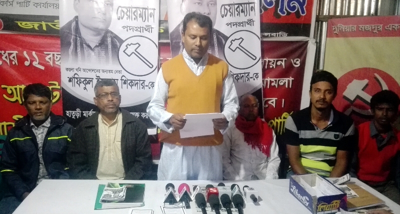 সকাল সাড়ে ১০টায় স্থানীয় চৌধুরীর মোড়স্থ উপজেলা শাখা ওয়ার্কার্স পার্টির অস্থায়ী কার্যালয়ে আয়োজিত সংবাদ সম্মেলনে ১৭ দফা লিখিত ইস্তেহার পাঠ করেন চেয়ারম্যান পদপ্রার্থী উপজেলা ওয়ার্কার্স পার্টির সাধারণ সম্পাদক শফিকুল ইসলাম শিকদার। এসময় উপস্থিত ছিলেন কৃষক নেতা মোর্শারফ হোসেন বাবু, আহম্মদ আলী খোকন, সুলতান ইসলাম, ওয়ার্কার্স পার্টির সদস্য মোস্তাফিজুর রহমান, ছাত্রনেতা আল আমিন, হাশেম রেজা রুবেল, সাজেদুর ইসলাম প্রমুখ।