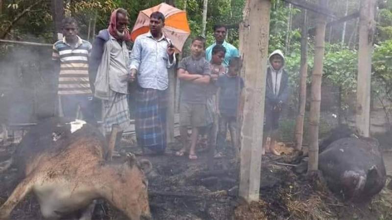 জানা যায়, গোয়াল ঘরে আগুন লাগলে মূহূর্তেইা পাশের খড়ের ঘরেও ছাড়িয়ে পড়ে। গোয়াল ঘরে বেধে রাখা গরুর আত্মচিৎকারে কৃষক কুশেদ মিয়ার ঘুম ভাঙ্গে। কিন্তু আগুন নেভানোর আগেই গোয়াল ঘরে রাখা ৫ টি গরু পুড়ে ছাই হয়ে যায়। তার সাথে পুড়ে যায় গোয়াল ও খড়ের ঘর। এতে অনুমানিক প্রায় ৪ লক্ষ টাকার ক্ষয়ক্ষতি হয়েছে বলে জানা যায়।