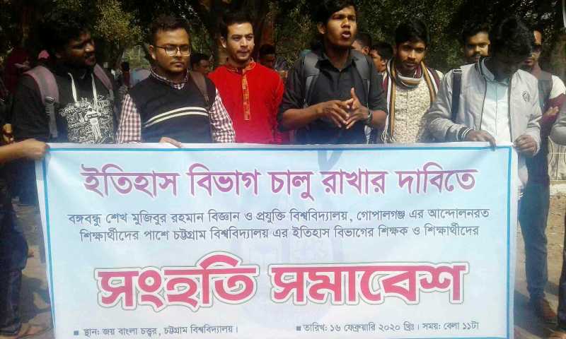 ইতিহাস বিভাগ চালু রাখার দাবিতে বঙ্গবন্ধু শেখ মুজিবুর রহমান বিজ্ঞান ও প্রযুক্তি বিশ্ববিদ্যালয়ে আন্দোলনরত শিক্ষার্থীদের পাশে চট্টগ্রাম বিশ্ববিদ্যালয়ের (চবি) ইতিহাস বিভাগের শিক্ষক ও শিক্ষার্থীদের সংহতি সমাবেশ অনুষ্ঠিত হয়েছে।