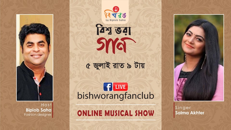 উৎসব পার্বণে উৎযাপনে ফ্যাশন হাউস বিশ্বরঙ অগ্রপথিক সুদীর্ঘ ২৬ বছর ধরে সেই ধারাবাহিকতায় বিশ্বরঙের কর্ণধার ও ডিজাইনার বিপ্লব সাহার ভাবনা, পরিকল্পনা ও সঞ্চালনায় আজ (৫ জুলাই) রাত ৯টা থেকে আবারো শুরু হতে যাচ্ছে দেশ ও দেশের বাইরের খ্যাতিনামা শিল্পীদের নিয়ে অনুষ্ঠান ‘বিশ্ব ভরা গান’।