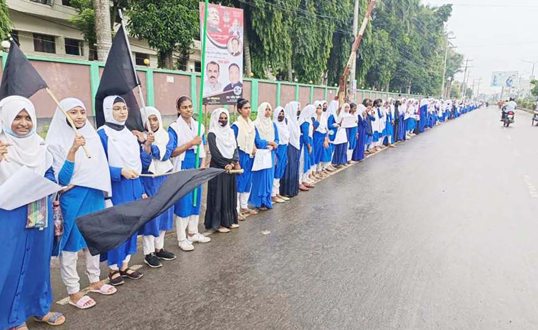 নিরাপদ সড়ক চাই-মায়ের কোল শূণ্য হওয়ার বিচার চাই-বেনাপোলে সড়ক পথের অব্যবস্থাপনার অবসান চাই’-এই প্লাকার্ড বহন করে ট্রাক চাপায় ৭ম শ্রেণীর মেধাবী স্কুল ছাত্রী আনিকা আক্তার শরিফা নিহতের প্রতিবাদে বেনাপোল মরিয়ম মেমোরিয়াল বালিকা বিদ্যালয়ের ও বেনাপোল ডিগ্রী কলেজের শত শত শিক্ষার্থীরা মানববন্ধন ও প্রতিবাদ সমাবেশ করেছেন বেনাপোল-প্রধান সড়কে।