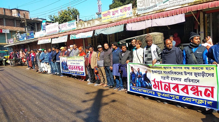 টাঙ্গাইলের ভূঞাপুরে সাংবাদিকদের উপর সন্ত্রাসীর হামলার প্রতিবাদে বিক্ষোভ মিছিল ও মানববন্ধন কর্মসূচী পালন করা হয়েছে। আজ শুক্রবার বেলা ১১টার দিকে ভূঞাপুর প্রেসক্লাবের উদ্যোগে এ বিক্ষোভ মিছিল ও মানববন্ধন পালিত হয়। বিক্ষোভ মিছিলটি পৌর এলাকার বিভিন্ন সড়ক প্রদক্ষিণ শেষে থানার মোড় চত্ত্বরে ঘন্টাব্যাপী মানববন্ধন কর্মসূচী পালন করা হয়।