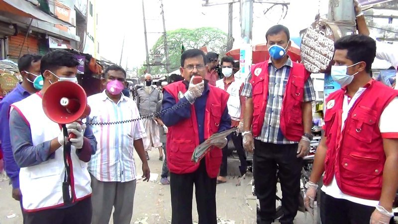 ভোলায় করোনা সচেতনতায় রেড ক্রিসেন্ট সোসাইটি মাইকিং ও লিফলেট বিতরণ করেছে।
