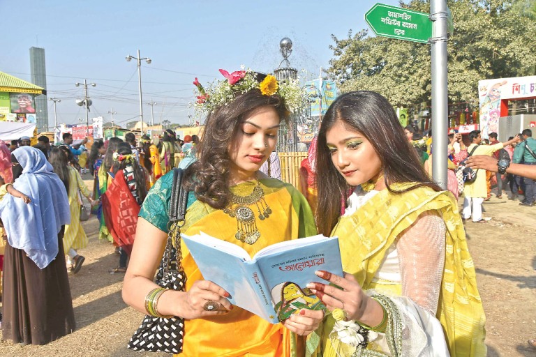 বাসন্তী রঙা শাড়ি আর পাঞ্জাবিতে পুরো বইমেলা চত্বর যেন ফাগুনের আঙিনা হয়ে উঠেছিল গতকাল। দলে দলে তরুণ-তরুণীসহ নানা বয়সী মানুষের ভিড়ে সোহরাওয়ার্দী উদ্যানসহ চারপাশ আগুনের রঙে রঙেছিল যেন। প্রতিবছর পহেলা ফাল্গুনে বইমেলার একই চিত্র থাকে। এদিন মানুষের পদচারণে ভরে ওঠে মেলা। যেন তিলধারণের ঠাঁই থাকে না। গতকালও সেই একই চিত্র।