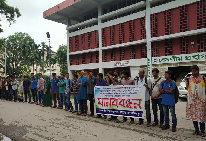 মানববন্ধনে রাবি রিপোর্টার্স ইউনিটির সাধারণ সম্পাদক আহমেদ ফরিদের সঞ্চালনায় সভাপতি মর্তুজা নুর বলেন, ‘বিভিন্ন সময় ছাত্রলীগ কর্তৃক সাংবাদিকরা নির্যাতিত হয়েছে। ২০১৬ সালে আমি ছাত্রলীগের মারধরের শিকার হয়েছি। ২০১৭ সালে সাংবাদিক আরাফাতের ওপর ছাত্রলীগ সন্ত্রাসীরা হামলা করেছে। কোনো দৃশ্যমান বিচার হয়নি।