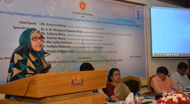 বাংলাদেশের ৬০ শতাংশ ভূমি সমুদ্রপৃষ্ঠ থেকে মাত্র ৫ মিটার উচ্চতায় অবস্থিত। সমুদ্রপৃষ্ঠের উচ্চতা বৃদ্ধি আমাদের জন্য বড় ঝুঁকি। সরকার জলবায়ু পরিবর্তন থেকে সৃষ্ট ঝুঁকি মোকাবেলাকে অগ্রাধিকার দিয়ে কর্মসূচি হাতে নিয়েছে। উপকূলীয় জনগোষ্ঠীর বিশেষত নারীদের জলবায়ু পরিবর্তনজনিত লবণাক্ততা মোকাবেলায় অভিযোজন সক্ষমতা বৃদ্ধিতে ২৭৪ কোটি টাকার (জিওবি ৬৬ কোটি টাকা ও সবুজ তহবিল থেকে ২০৮ কোটি টাকা) প্রকল্প বাস্তবায়ন করবে মহিলাবিষয়ক অধিদপ্তর ও জনস্বাস্থ্য প্রকৌশল অধিদপ্তর।