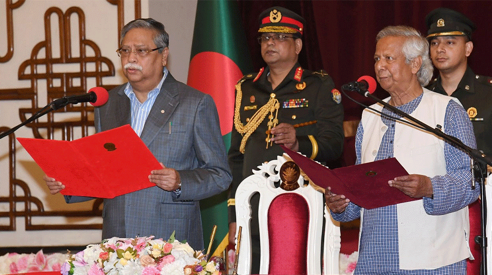 অন্তর্বর্তী সরকারের প্রধান উপদেষ্টা হিসেবে শপথ নিয়েছেন শান্তিতে নোবেলজয়ী অধ্যাপক ড. মুহাম্মদ ইউনূস।