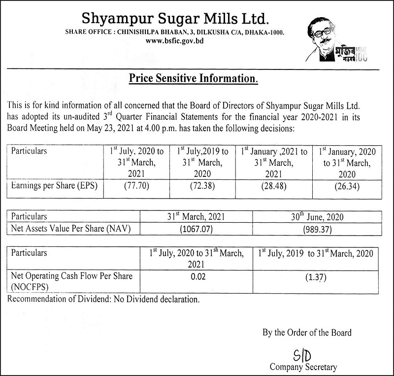 পুঁজিবাজারে তালিকাভুক্ত কোম্পানি শ্যামপুর সুগার মিলের গত ৩১ মার্চ, ২০২১ তারিখে সমাপ্ত তৃতীয় প্রান্তিকের (জানুয়ারি’২১-মার্চ’২১) অনিরীক্ষিত আর্থিক প্রতিবেদন প্রকাশ করেছে।